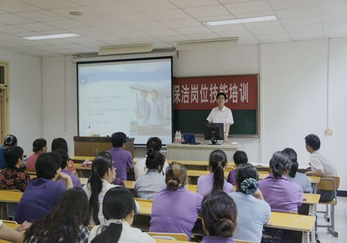 公司領(lǐng)導(dǎo)給保潔員上培訓(xùn)課,保證保潔員理論與實(shí)踐培訓(xùn)合格上崗。